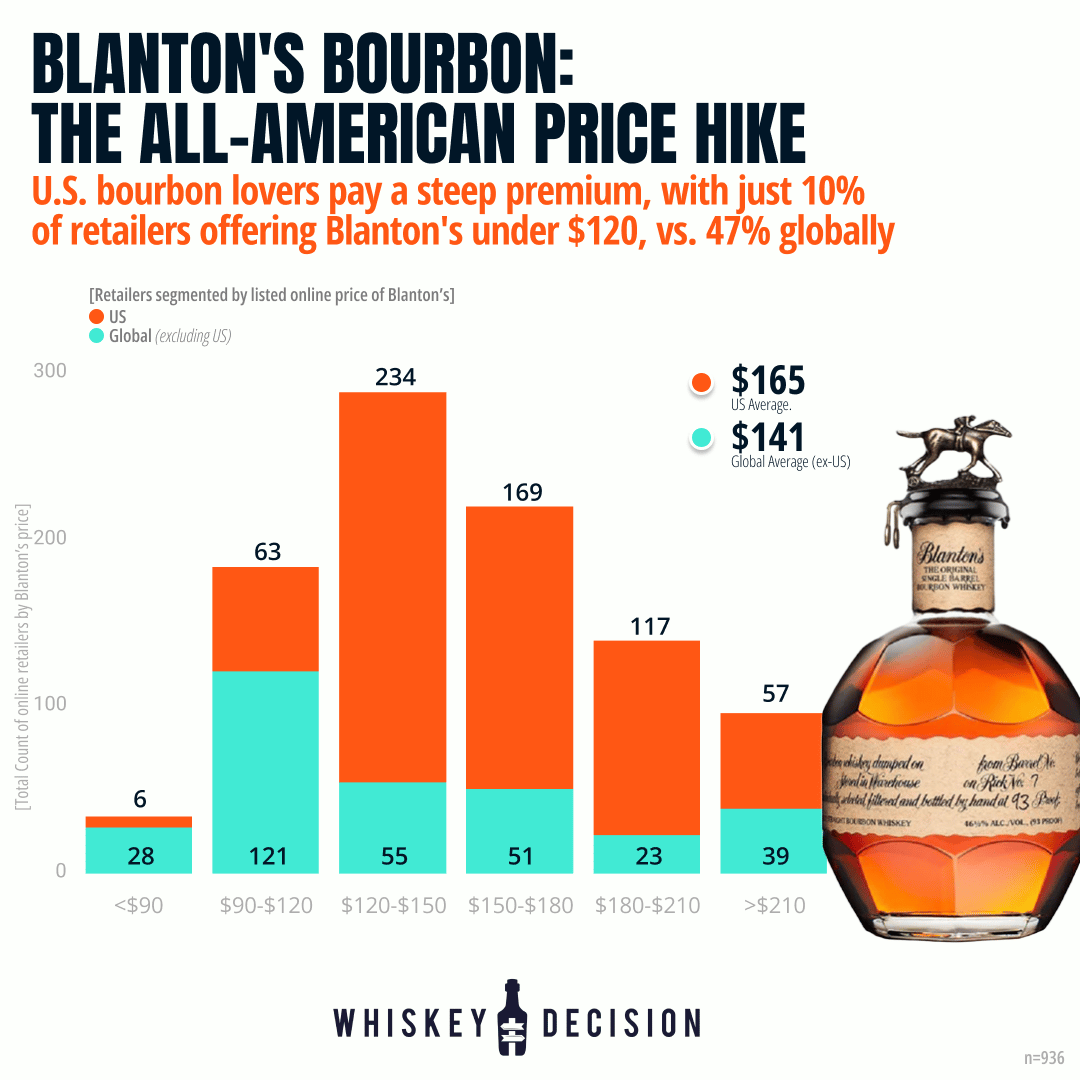 All this hype got us wondering: is the rest of the world just as crazy about this bourbon? The answer is a “maybe.” The United States seems to have a special place in its heart for Blanton's, and the proof is in the $24 average price difference between the US and the rest of the world. Only 10% of US retailers offer Blanton's below $120, while 47% of global retailers do. And Africa, of all places, has the cheapest average price for Blanton's at $66.